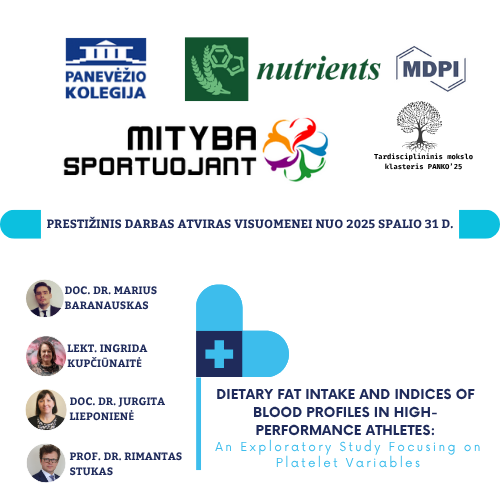 Panevėžio kolegijos Biomedicinos ir Technologijų mokslų fakultetų ir Vilniaus universiteto Visuomenės sveikatos katedros dėstytojai dr. Marius Baranauskas, lekt. Ingrida Kupčiūnaitė, dr. Jurgita Lieponienė ir prof. dr. Rimantas Stukas paskelbė aukšto lygio aktualų mokslo darbą „Dietary Fat Intake and Indices of Blood Profiles in High-Performance Athletes: An Exploratory Study Focusing on Platelet Variables“.