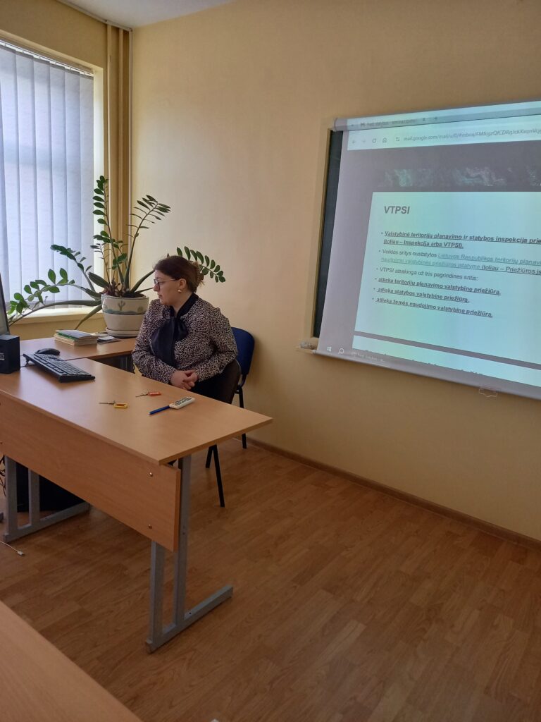 Šį pirmadienį studijų programos Statybos inžinerija studentai statybai keliamus reikalavimus, sprendinius, susijusius su kultūros paveldu, savavališkos statybos problemas aptarė su buvusia kolegijos teisės studijų studente, o dabar Valstybinės teritorijų planavimo ir statybos inspekcijos prie Aplinkos ministerijos, Vidurio Lietuvos teisės skyriaus patarėja Laurita Nakrošiene.