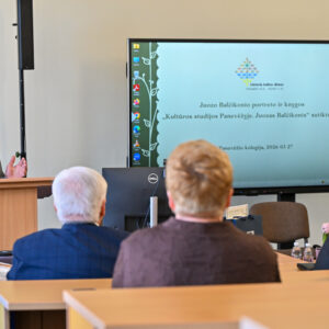 Paskutinį kovo penktadienį Panevėžio kolegija ir Lietuvių kalbos draugija sukvietė lietuviško žodžio ir kultūros puoselėtojus į kalbininko, vertėjo, pedagogo Juozo Balčikonio portreto Panevėžio kolegijoje ir knygos ,,Kultūros studijos Panevėžyje. Juozas Balčikonis“ sutiktuves, skirtas Lietuvių kalbos dienoms. Įžangos žodį taręs kolegijos direktorius dr. Gediminas Sargūnas pasidžiaugė, kad aukštosios mokyklos istorijoje įrašomas naujas puslapis: J. Balčikonio auditorijoje pristatomas kolegijos dėstytojo, dailininko Sigito Laurinavičiaus kalbininkui sukurtas portretas bei ką tik dienos šviesą išvydusi panevėžietės redaktorės, leidėjos, Komunikacijos centro ,,Kalba. Knyga. Kūryba“ vadovės Lionės Lapinskienės sudaryta knyga. Jis pažymėjo, jog kolegijoje įkurta didžio kalbininko auditorija, tai tarsi simbolinė vieta, kurioje susitinka Mokytojų seminarijos istorija ir kolegijos nūdiena. Priminė, kad 2012 m., švenčiant mokslo įstaigos veiklos dešimtmetį, buvo įvykdytas svarus projektas, atvėręs iki tol dulkėmis nusėdusius kultūros klodus. Tuomet atidaryta auditorija, skirta kalbininkui Jonui Jablonskiui, dirbusiam Panevėžio mokytojų seminarijoje atminti bei pristatyta misterija ,,Nubudom kalbos geležy.“ O 2016 m. išleista istoriškai vertinga knyga ,,Kelias nuo Mokytojų seminarijos iki Panevėžio kolegijos.“ 2025 metais, minint J. Balčikonio 140-ąsias gimimo metines, buvo įkurta jo vardo auditorija. Baigdamas įžangos žodį kolegijos direktorius linkėjo , kad ši erdvė taptų jaukia ir dvasinga vieta, jungianti praeitį ir dabartį.